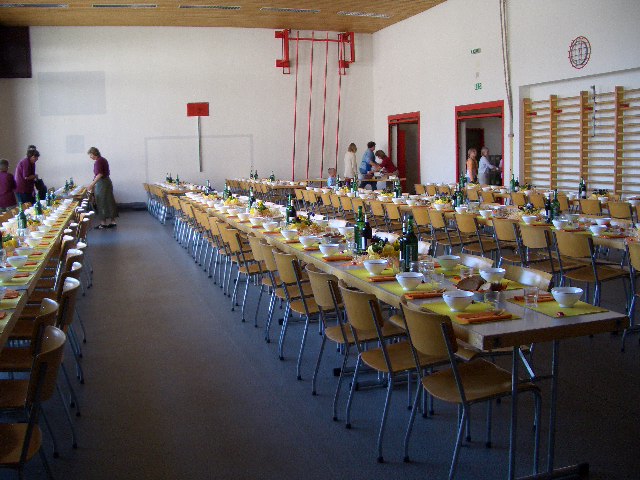 学校の体育館に移動して、食事です。